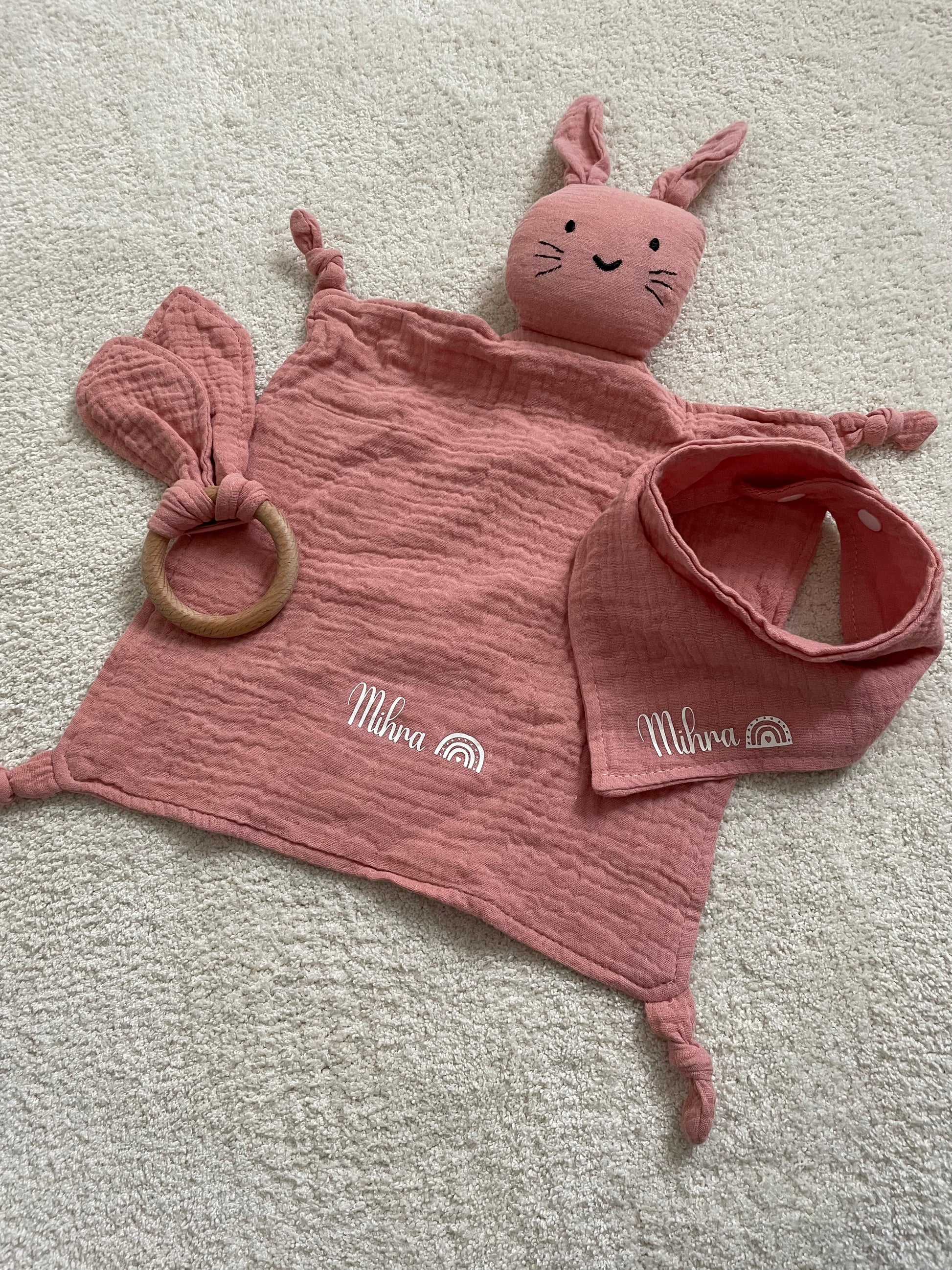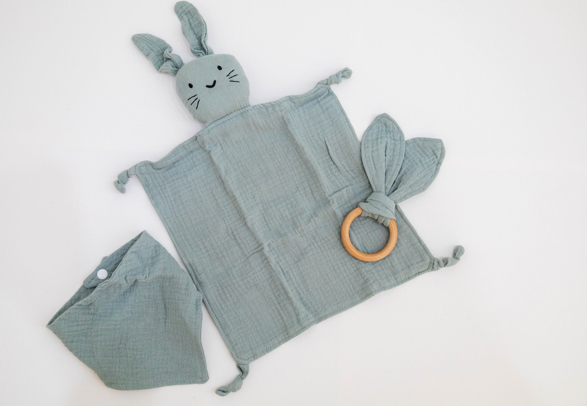 Das Geschenkset "Hase" beinhaltet ein weiches Musselin Dreieckstuch, einen Beißring aus natürlichem Holz und ein kuscheliges Häschentuch. Ideal für Babys Entwicklung und zum Spielen. Perfekt als Geschenk für frischgebackene Eltern oder als schöne Ergänzung für die Babyausstattung.