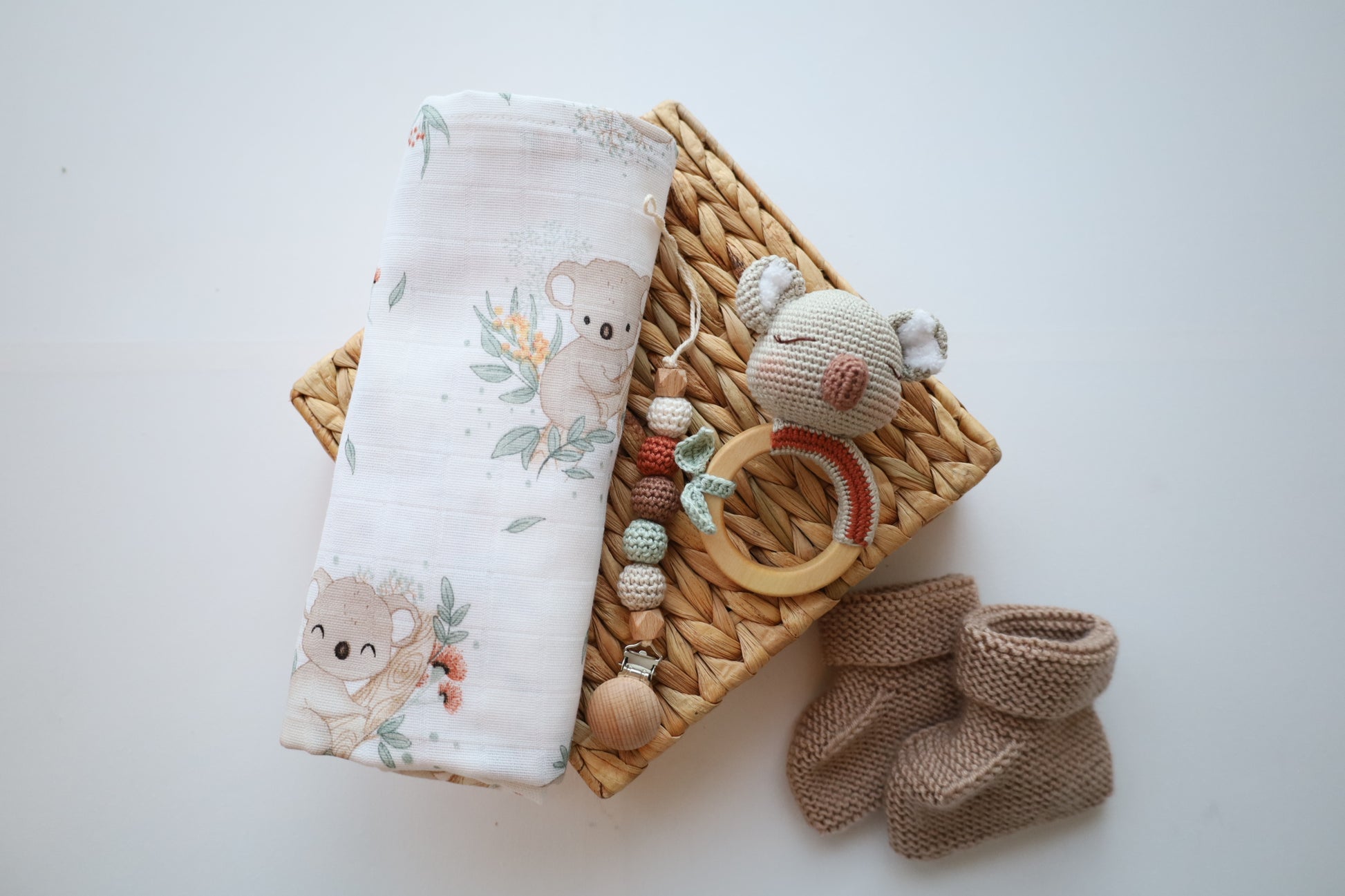 Das Geschenkset Koala beinhaltet eine schöne bunte Schnullerkette, ein weiches Musselintuch, eine handgefertigte Rassel und süße gehäkelte Babyschuhe. Perfekt als Geschenk zur Geburt oder für werdende Eltern. Sorgen Sie für Komfort und Spielspaß für das Baby mit diesem liebevoll zusammengestellten Set aus Biobaumwolle.