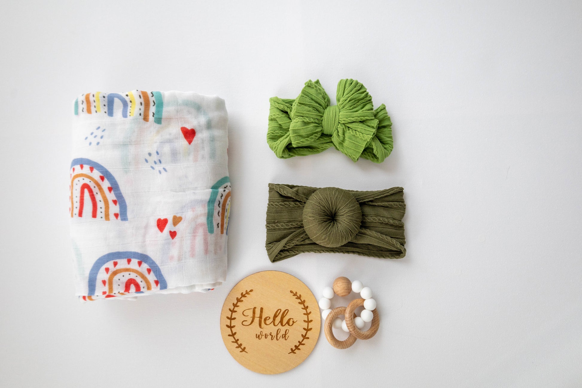 Das Geschenkset Regenbogen enthält 5 Teile: 2 Haarbänder, einen Beißring, ein Baumwolltuch und eine Holzkarte. Hochwertige Materialien gewährleisten Sicherheit und Komfort. Das ideale Geschenk für werdende Mütter und ihre Kleinen.