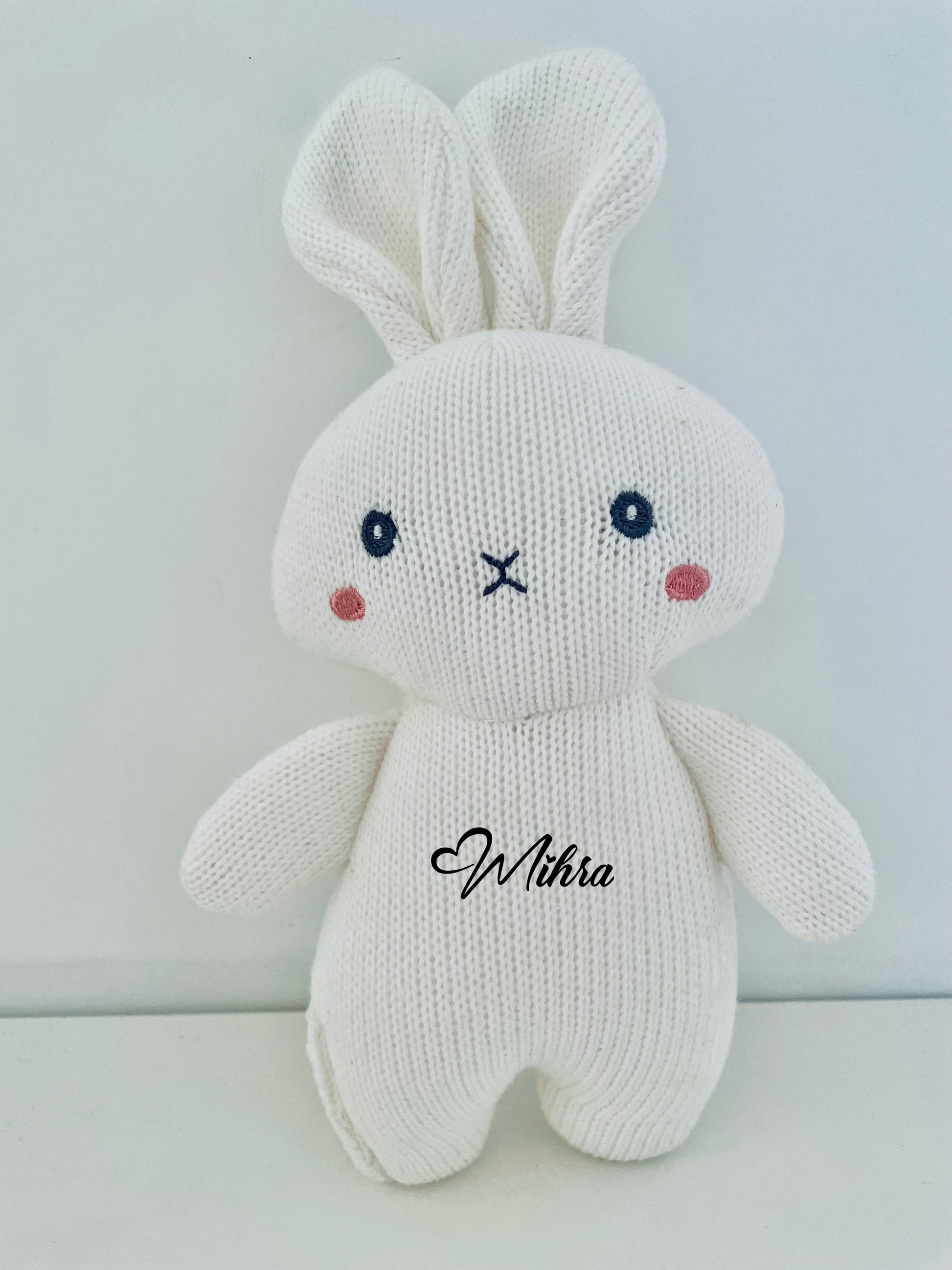 Dieser liebevoll handgefertigte Plüschtier Hase aus weichem Wollstrick lädt zum ausgiebigen Kuscheln ein. Das integrierte Glöckchen sorgt dabei für zusätzliche Freude und fördert die Sinne. Ideal als süßes Geschenk oder als treuer Begleiter für Kinder.